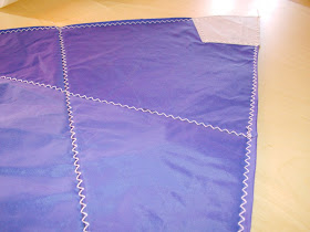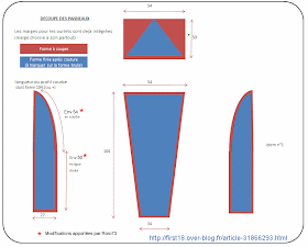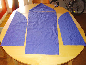 plans que j'ai trouvés sur le site de l'assoc des First 18. Très bien expliqué, j'ai suivi quasiment les plans à la lettre. Quant au tissu, j'ai utilisé du tissu technique d'une veille tente que j'ai achetée pour 1 EUR au marché aux puces ce week-end. En plus, la tente est bleue! Quelle chance, non? Voici la fabrication en images: