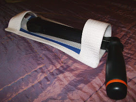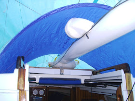 Ah la belle pluie me rend très efficace... :) Aujourd'hui, vu qu'il pleut et qu'il ne fait vraiment pas beau, le programme c'était du rangement et un peu de couture. Du coup, de quoi mieux à faire que de coudre quelques housses de manivelle pour le Bobato. Le tissu bleu c'est une chute de Sunbrella et le tout bordé en sangle blanc. Ça rend la housse bien rigide. Une housse de manivelle pour moins de 5 euros. C'est la saison de bonnes affaires!