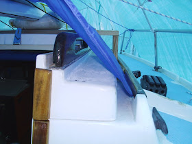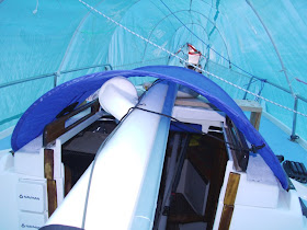 Ca fait quelques semaines depuis que je suis passé au bateau. Vu le temps dernièrement, travailler sur le bateau s'avère un peu difficile. Enfin, s'il y avait juste un peu de soleil... Du coup, ce matin j'ai profité pour vérifier la bâche. Elle tient toujours. :) Il y a de la neige, mais rien sur la bâche! Quelle merveille!