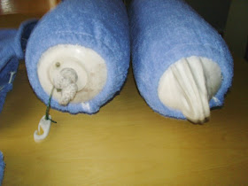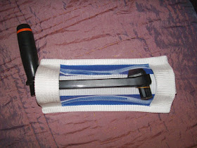 Inspiré par mon ami Pascal qui vient de réaliser un lot de chaussettes de pare-battage, je me suis lancé également. On utilise du tissu éponge (serviette) acheté chez le magasin de tissu du coin à 9,90EUR le mètre linéaire. J'ai pris du bleu clair mais en réfléchissant dans la voiture juste après l'avoir acheté, je n'aurais pas dû... C'est trop clair et il va se salir. Bon tant pis, ça se fabrique rapidement donc je fais un premier essai. Il faudra voir aussi comment le tissu va tenir dans le temps. Je pense qu'il va s'éclaircir. Peut-être la prochaine fois, je prendrai une couleur bien foncée comme du noir et puis avec le soleil il deviendra grisâtre. Enfin, je suis content du résultat. Encore merci à Pascal d'avoir lancé le défi! ;)